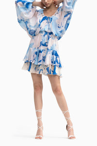 Mystic blue printed dress cut from airy chiffon with batwing sleeves and gold eyelet detailing along the neckline.