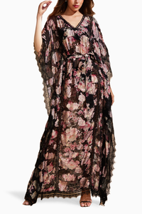 Featuring Mystic Harmony Printed Kaftan by Roseroom, a Black and Pink hue kaftan. Crafted from Georgette and adorned with printed embroidery and delicate laces, it offers a standard fit for an effortlessly stylish and comfortable look.