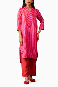 The Mystic Pink Kurta Set is crafted from the finest handwoven silk satin, combining luxurious texture with vibrant design. The kurta features a striking pattern of pink and scarlet stripes, creating a bold and contemporary look.