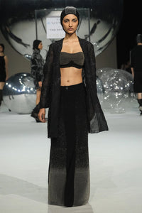 Featuring the Mystic Trench Shirt, a lightweight longline jacket crafted in sheer black organza. It showcases all-over hand-embroidered black PVC cords that evoke an abstract botanical mystique. Finished with full sleeves and cuffs for a refined silhouette.