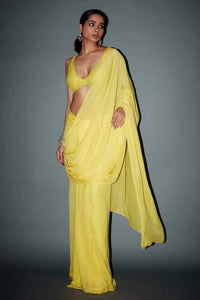 Featuring the Naadia Yellow Sari by ITRH's Diwali Jaaneman Collection, this vibrant yellow ensemble includes a crystal-embellished blouse paired with a pre-draped saree, offering a seamless blend of traditional elegance and modern sophistication for any festive occasion.