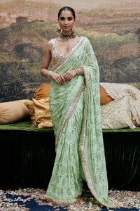Mint green Lucknowi saree, adorned with intricate hand-embroidery and gota kiran on border, paired with a stunning mirror work blouse on gota lined with chanderi silk.