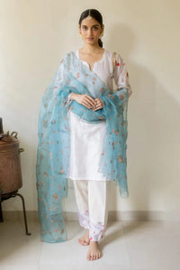 Handblock Printed Naaz Kurta Set crafted in luxurious silk with a relaxed fit, featuring side kalis, side slits, and intricate hand embroidery with sequins and zari on the front. Paired with a blue organza silk dupatta adorned with scallop detailing and chanderi silk trousers accentuated with block print detailing on the hemline.