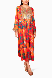 Illuminate your festive wardrobe with the Nadine Kaftan that comes with pants, a stunning orange-printed kurta that exudes vibrant charm and elegance. This beautifully designed outfit features intricate embellishments that add a touch of glamour, making it the perfect choice for celebratory occasions.