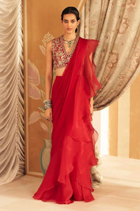 Embrace timeless elegance with our Red Sari Set, a quintessential piece in every wardrobe. This stunning ensemble features a V Neck blouse adorned with intricate gold embroidery and delicate threadwork, creating a captivating mix of floral motifs. Paired with a classic chiffon organza ruffle Sari, this Ridhi Mehra signature design effortlessly combines tradition and modernity. The rich, traditional red hue symbolizes love and celebration, making it a must-have for weddings, receptions, and festive occasions. Versatile and graceful, this Sari set is designed to be worn across multiple events, ensuring you radiate elegance and charm wherever you go.