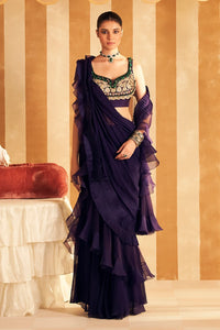Make a statement with our Purple Sari Set, a stunning fusion of tradition and contemporary elegance. This exquisite ensemble features a flaunting neckline adorned with intricate gold embroidery, delicate threadwork, and a captivating mix of floral motifs, further enhanced by emerald accents that add a touch of oomph. The blouse is paired with a chiffon Sari and an organza ruffle Sari, showcasing Ridhi Mehra's classic double drape ruffle design. Perfect for weddings, receptions, and grand celebrations, this must-have Sari set ensures you turn heads with its luxurious detailing and rich purple hue, making it a standout piece in any wardrobe.
