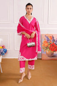 Featuring premium Cotton Chanderi fabric for a soft, breathable feel, this elegant ensemble is highlighted by intricate dori work and embroidery on the neckline, kurta edge, and sleeve cuffs. The V-neckline offers a flattering silhouette, while 3/4th sleeves are adorned with delicate embroidery. Paired with complementing straight pants featuring embroidered edging, this look blends refined detailing with timeless charm.