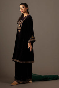 Our Naheed kurta features heavily embroidered neckline and sleeves, intricately detailed with sequins, cut dana, silk thread work, zari, and a subtle touch of gota patti. The rest of the silhouette is kept solid, lending it a clean, elegant, and timeless appeal. It is paired with wide pants finished with an embroidered border, making it perfect for a classy statement wedding look.