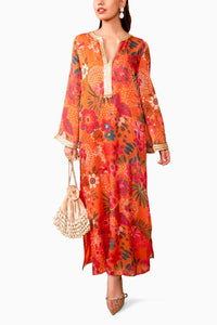 Step into the spotlight with the Naina Long Kaftan, a dazzling piece that perfectly blends vibrant style with opulent details. This striking kaftan features a bold orange print that commands attention, complemented by exquisite gold detailing that adds a touch of luxury and sophistication.