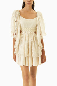 Featuring Nancy Dress is a chemical lace short dress with white mesh rainbow swarosvki detailing on the bodice. It has cutout waist with chemical lace asymmetric gathered sleeves. Concealed zipper at back, smocked back bodice.
