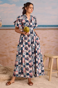 The charming Naples Maxi Dress features a vibrant patchwork print of florals and geometric patterns in soft pinks, navy blues, and whites. With puff sleeves, a flattering V-neckline, and a flowy silhouette, it's perfect for both casual days and elevated occasions. Pair it with strappy sandals and dainty earrings for a breezy daytime look, or dress it up with wedges and a woven clutch for a sunset soirée.