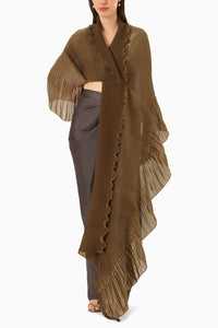 Make a statement with Ritika Arya Jain's Naqia Mouse Gold Top & Drape Skirt. This luxurious two-piece coord set blends satin and micropleated fabric in a stunning mouse gold shade, offering a true-to-size fit and an effortlessly elegant silhouette for any occasion.