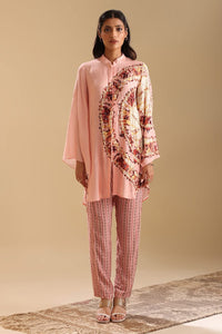 The pink naqsh embellished apple hem shirt with printed pants in luxurious cotton silk combines contemporary charm with traditional elegance. Featuring delicate naqsh embroidery on a soft pink apple-hem shirt and vibrant, patterned pants, this lightweight and comfortable ensemble is perfect for festive gatherings or casual outings, exuding effortless grace and style.