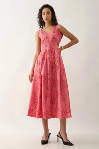 Featuring the Anther Print, the Naru Salmon-Colored Dress offers a sleeveless, round-neck design with pleats and topstitch detailing for added depth. Soft pleats create graceful movement, while delicate string accents enhance its airy charm, making it a refined yet relaxed choice for casual or elevated occasions.