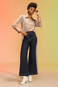 Featuring Nash Blue Pants by Chilosophy's Queendom Collection, these modern bell-bottom trousers feature flat ribbon and stitch line detailing, with quirky lip embroidery on the back pocket. The embroidered quote "slay your day everyday" on the waistbelt adds a fun, empowering touch.