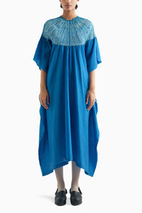 Elevate your wardrobe with our exquisite free-size silk kaftan, a masterpiece of elegance and craftsmanship. This luxurious kaftan features our signature shibori neckline, which is meticulously adorned with hand-stitched gota and beaded detailing, creating a captivating interplay of texture and shimmer. Dyed in a vibrant methyl blue color, this versatile piece seamlessly transitions from day to night, offering both comfort and sophistication.With its striking color and exquisite detailing, this kaftan is sure to make a memorable impression.