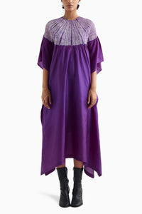 Elevate your wardrobe with our exquisite free-size silk kaftan, a masterpiece of elegance and craftsmanship. This luxurious kaftan features our signature shibori neckline, which is meticulously adorned with hand-stitched gota and beaded detailing, creating a captivating interplay of texture and shimmer. Dyed in a rich, regal purple color, this versatile piece seamlessly transitions from day to night, offering both comfort and sophistication.With its striking color and exquisite detailing, this kaftan is sure to make a memorable impression.