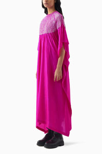 Elevate your wardrobe with our exquisite free-size silk kaftan, a masterpiece of elegance and craftsmanship. This luxurious kaftan features our signature shibori neckline, which is meticulously adorned with hand-stitched gota and beaded detailing, creating a captivating interplay of texture and shimmer. Dyed in a rich and radiant Rani color, this versatile piece seamlessly transitions from day to night, offering both comfort and sophistication.With its striking color and exquisite detailing, this kaftan is sure to make a memorable impression.