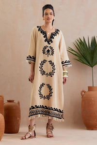 The Natural and Black Thread Embroidery Jute Maxi Dress is made from eco-friendly jute, featuring bold black thread embroidery on a natural base. Its flowing maxi silhouette provides comfort and breathability, making it perfect for both daily wear and vacation. The striking contrast of black embroidery against the natural jute creates a stylish, rustic look that stands out effortlessly.