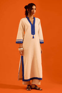 Featuring a jute tunic set with indigo blue thread embroidery, this relaxed-fit outfit is crafted from jute fabric, blending rustic charm with refined detailing for an effortlessly elegant look.