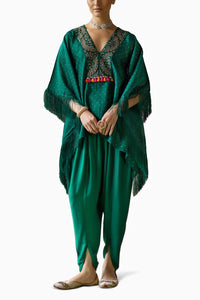 Featuring Navi Co-Ord Set by Shikha Mehta from their Kala Collection. This vibrant ensemble showcases an emerald silk chanderi top, elegantly embroidered and block printed with stylish fringes on the sides. Paired with luxurious satin cowl pants and a comfortable cotton slip, it offers a perfect blend of sophistication and ease. Ideal for both casual outings and festive celebrations, this co-ord set is a standout choice for any occasion.