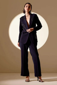 Featuring the Navy Blue Celestial Embroidered Set by ANAHE, this elegant ensemble includes a finely embroidered blazer paired with matching pants. The intricate celestial designs add a touch of sophistication and modern flair, perfect for any stylish occasion.