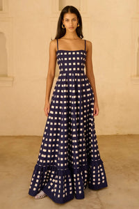 Featuring the Navy Blue Checkmate Dress by DeCastro Moda, this stylish checkered dress is accentuated with corset detailing, offering a modern twist on a classic pattern for a flattering silhouette.