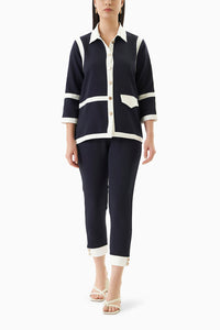 Shivya K is an ideal choice for any casual occasion you might be attending this season. It consists of navy blue top crafted in luxury crape with white detailing at the pockets, collar, placket, sleeves and the hemline. It comes with matching pair of pants. Complete the look with silver-tone accessories.
