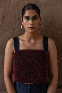 Featuring Navy Blue Comfort Crop Top by Somya Goyal's Comfort Zone Collection, this fitted crop top showcases our signature pink hand-looped recycled PVC embroidery, complete with straps, a square neckline, and a zipped side, combining bold design with a sleek, cropped silhouette.
