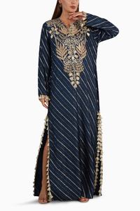 The navy blue dola silk embroidered long beyza kaftan is a sophisticated and luxurious piece that combines classic elegance with modern design. Crafted from rich dola silk, this kaftan features intricate embroidery that adds a touch of opulence to the deep navy blue color. The long, flowing silhouette creates a flattering and graceful look, while the embroidery enhances the overall charm and appeal.Â