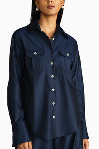 Featuring the Navy Blue Egyptian Cotton Oversized Long-Sleeved Shirt by Refined Revolution. Crafted from 100% Egyptian Giza cotton with a luxurious 120/2 thread count, it features shell-effect buttons. Designed for an oversized and relaxed fit, it stays true to size.