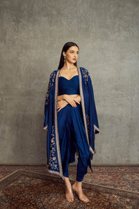 Featuring navy blue hand embroidered cape paired with textured bandeau and dhoti pants. The set is crafted with the finest materials and will accentuate the look.