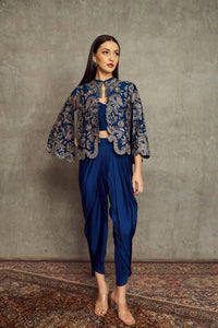 Navy Blue Embroidered Cape with Bandeau and Dhoti Pants