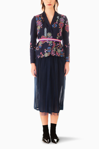 A versatile essential for every wardrobe. Crafted from premium fabric in a classic navy blue hue. Its tailored silhouette and clean lines offer a flattering fit that is perfect for both casual and formal occasions. Paired with a skirt, crafted from delicate net fabric in a rich midnight blue hue, this skirt exudes romance and sophistication. The flowing silhouette drapes gracefully, creating a mesmerizing and ethereal look. Perfect for special occasions or romantic evenings, this set is sure to captivate with its timeless charm and enchanting allure.