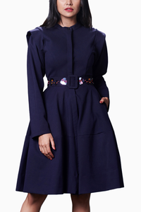 Featuring Navy Blue Jacket Dress With Hand Embroidered Belt by Deepika Arora. Tailored from premium Ponte Roma fabric, this ensemble epitomizes modern sophistication. Elevate your wardrobe with its hand-embroidered belt, exuding timeless charm in rich navy blue.