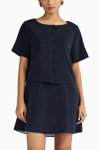 Stretch suiting jacket top in navy blue, featuring a round neckline, short sleeves, and fabric buttons, and designed for a relaxed, boxy fit with a slightly cropped length.