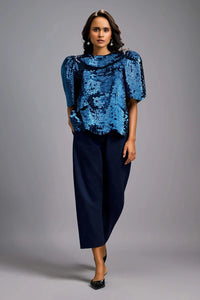 Navy Blue Textured Shimmer Sculptural Shoulders Top with Cropped Pants