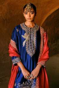 Make a statement with our Embroidery Tunic set, featuring a stylish tunic, matching dhoti, and elegant dupatta. Crafted from luxurious dupion silk, this stunning ensemble showcases a rich navy blue and vibrant red color combination, adorned with intricate Zardosi embroidery. Perfect for festive occasions and celebrations, this outfit blends traditional charm with modern flair. Embrace your unique style with this eye-catching look!