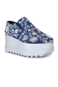 For a night filled with stars where you shine the brightest. Our Celestial wedge sneakers sit on a silver wedge and are adorned with elegant silver zari and pearl embellishments. Like constellations in the sky on a starry night, the shoe is crafted in beautiful blue satin embroidered with floral motifs. This design is perfect for the final chapter in a saga of celebrations; it is bold, fresh, and a showstopper.