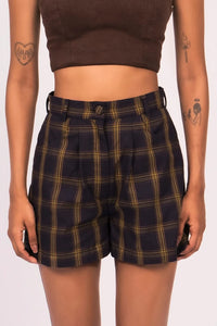 These high-waisted navy check shorts offer a refined yet relaxed look, featuring a front pleat and front fly closure for a tailored fit. The round front pockets add a soft touch, while back patch pockets maintain a laid-back vibe. Perfect for pairing with a blouse or a casual tee for a versatile, easygoing look.