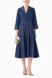 Featuring a Cotton Satin Dawn navy embroidered midi dress with a panelled design and subtle piping details. It boasts a striking tree embroidery on the back yoke, practical side pockets, and elegant pintuck accents on the collar and cuffs for a refined finish.