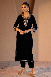 The kurta, made from luxurious velvet fabric, features a rich texture that shimmers with light, offering an opulent touch. The deep navy blue hue enhances its sophisticated look, making it versatile for any grand occasion. Paired with tailored, narrow-fit pants, this ensemble creates a sleek and polished silhouette, ensuring you make a stunning statement at weddings, festivals, or special events.