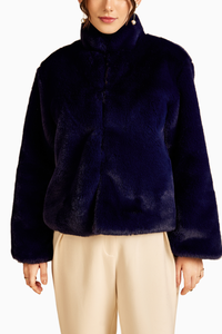 Stay stylishly warm in our blue fur jacket featuring a high neck standing collar. The front opening is adorned with hooks and buttons, and the silk lining adds a touch of luxury. Perfect for braving extreme cold days with both comfort and flair.