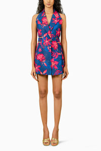 This Sleeveless Halter Neck Mini Blazer Dress in heavy crepe features a fitted band and notched collar, showcasing a striking navy and fuchsia floral print. A bold blend of power and playfulness, it offers a modern, structured silhouette perfect for standout occasions.