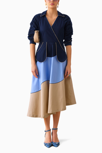 Introducing her Navy, Blueberry & Ecru Cotton Color Block Dress, a stunning blend of style and comfort. This wrap yoke design features a vibrant tri-color block pattern, complemented by an asymmetrical hem and statement pockets for a unique touch. With piping details and 3/4th gathered sleeves with cuffs, this dress combines elegance with a playful flair. Perfect for any occasion, it’s a versatile addition to your wardrobe!