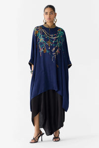 The Navy Maharani Kimono & Knot Skirt crafted from our stunning vegan silk fabrication, trans-seasonal, is a statement piece. This kimono, printed with our maharani necklace placement print, is free size. It has a hand embroidered collar and a metallic zipper. With an asymmetric cut, it looks stylish. It is paired with our solid knot skirt with a side zipper. Wear it with heels for an elegant look.