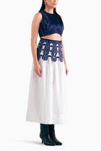 The Navy Metallic Ruched Top with Denim Cut Out Loop Skirt combines a shimmering foil taffeta top with a bold, cotton denim skirt. The top's elegant ruching and metallic finish pair effortlessly with the skirt’s unique cut-out loop detailing, creating a modern and sophisticated ensemble.