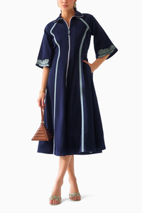 Elevate your style with our Paradise Navy Cotton Satin Dress. This stunning zip-down midi features intricate leaf embroidery and chic leaf appliqués on the sleeves. The unique seafoam and white color block piping adds a fresh touch, while the front white zipper boasts a delicate leaf-embroidered slider. With convenient side pockets and a flattering fit-and-flare silhouette, this dress is perfect for any occasion. Embrace effortless elegance!