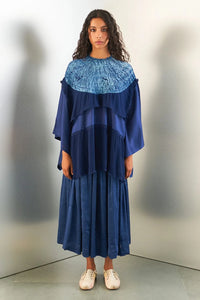 A freesize top, layered in navy silk and chiffon, featuring our signature shibori detail around the neckline.