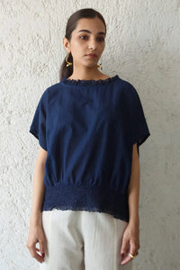 The Scrunchy Waist Blouse is a beautifully relaxed silhouette crafted from handwoven cotton with delicate sheer silk accents. Designed for effortless elegance, it features a soft, scrunched detail at the boat neckline and waist, creating a gently gathered effect that enhances its fluid drape. The cap sleeves add a touch of femininity, while the lightweight fabric ensures breathability and comfort. In a versatile navy hue, this free-size blouse fits up to a 41-inch (104 cm) chest, making it a timeless addition to any wardrobe.